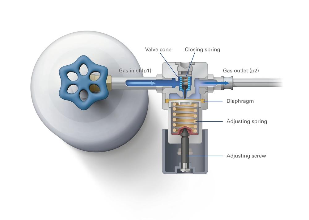 The use of a diaphragm seals the gas cylinder content from the environment and is mechanically connected to the valve of the pressure regulator. With the adjusting screw on the pressure regulator, it is possible to change the adjusting screw pressure and thus set the desired outlet pressure.