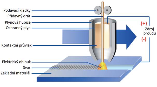 Svařování metodami MIG/MAG využívá k získání potřebné tepelné energie elektrického oblouku, který hoří mezi odtavující se drátovou elektrodou a základním materiálem. Svarová lázeň a její blízké okolí je ochráněno ochranným plynem, který zamezuju přístupu okolní atmosféry. Chemické složení ochranného plynu je rozdělujícím faktorem metod MIG a MAG. Metoda MIG používá k ochranně svarové lázně inertního (netečného) plynu, zatímco metoda MAG plynu aktivního. Přídavný materiál ve formě drátu je podáván do hořáku.