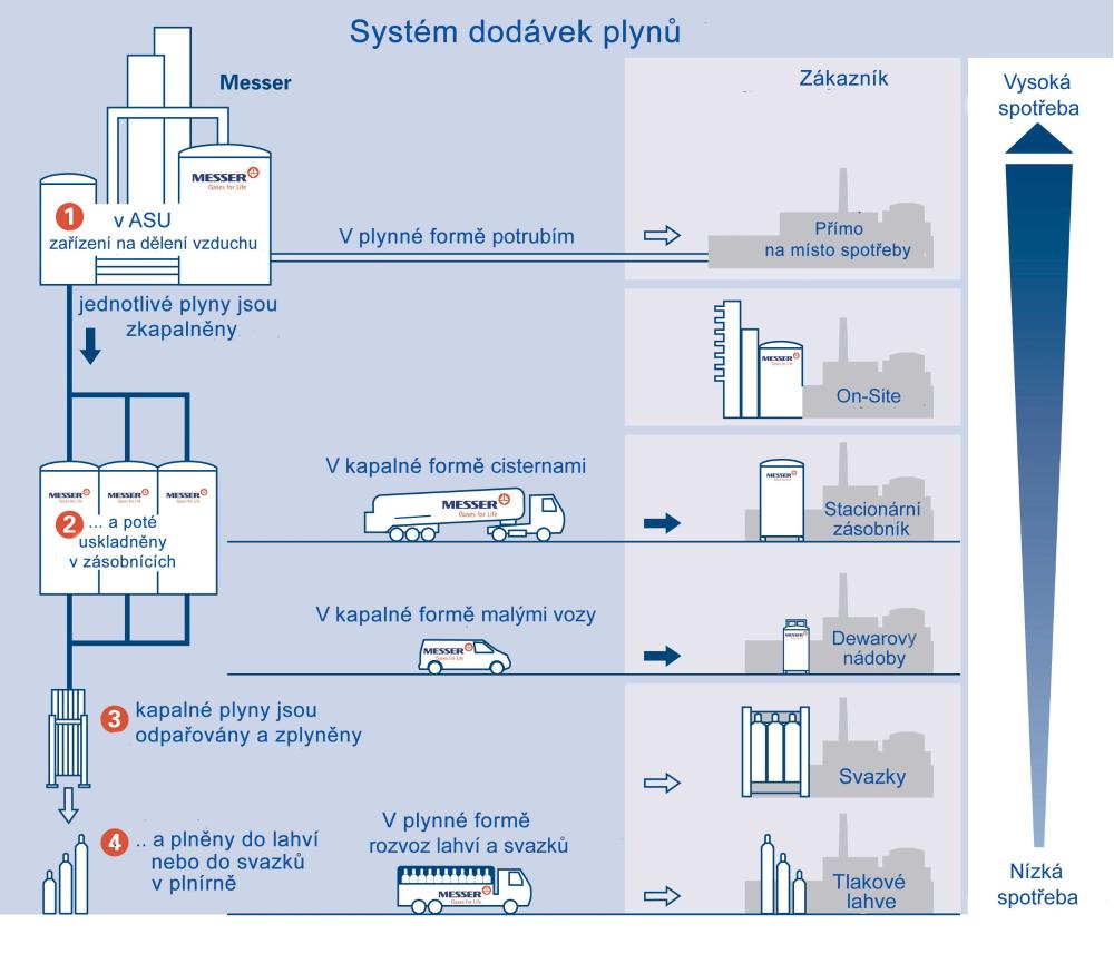 - Forma dodávek v lahvích, dodání kapaliny nebo výroba v místě spotřeby (on-site) je dalším