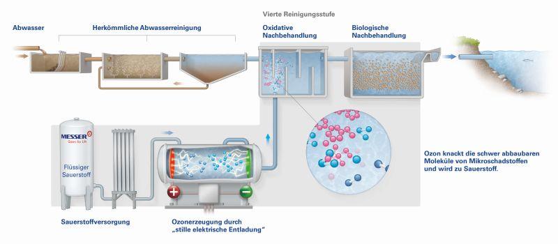 Das starke Oxidationsmittel Ozon eliminiert viele problematischen Substanzen vollständig oder aber oxidiert diese so weit, dass sie anschliessend biologisch abbaubar sind. Eine ergänzende Behandlung mit Ozon wird manchmal vor und häufig nach der biologischen Reinigung durchgeführt.