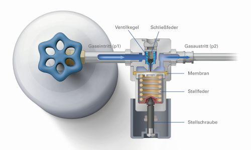 Zur Entnahme von Gas aus einem Druckgasbehälter kommen sogenannte Druckminderer zum Einsatz.